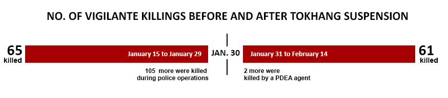 But the quiet period was short-lived. Based on online reports and tallies of The Inquirer and ABS-CBN Online, the 15 days which followed the suspension order recorded 63 drug-related deaths, 61 of which were attributed to unidentified perpetrators, and two to PDEA, which had taken over from the PNP-AIDG. The number is only 4 counts short of the 65 vigilante killings that were recorded from January 15 to 29 before the suspension order.